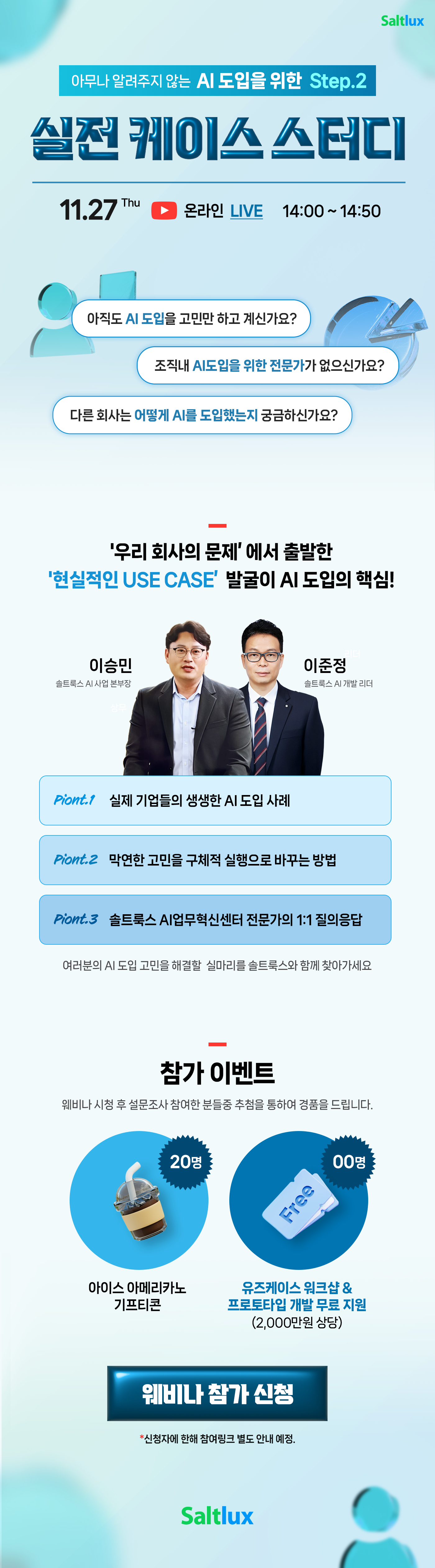 이번 웨비나에서 여러분의 AI 도입 고민을 해결 할 실마리를 솔트룩스와 함께 찾아가세요.